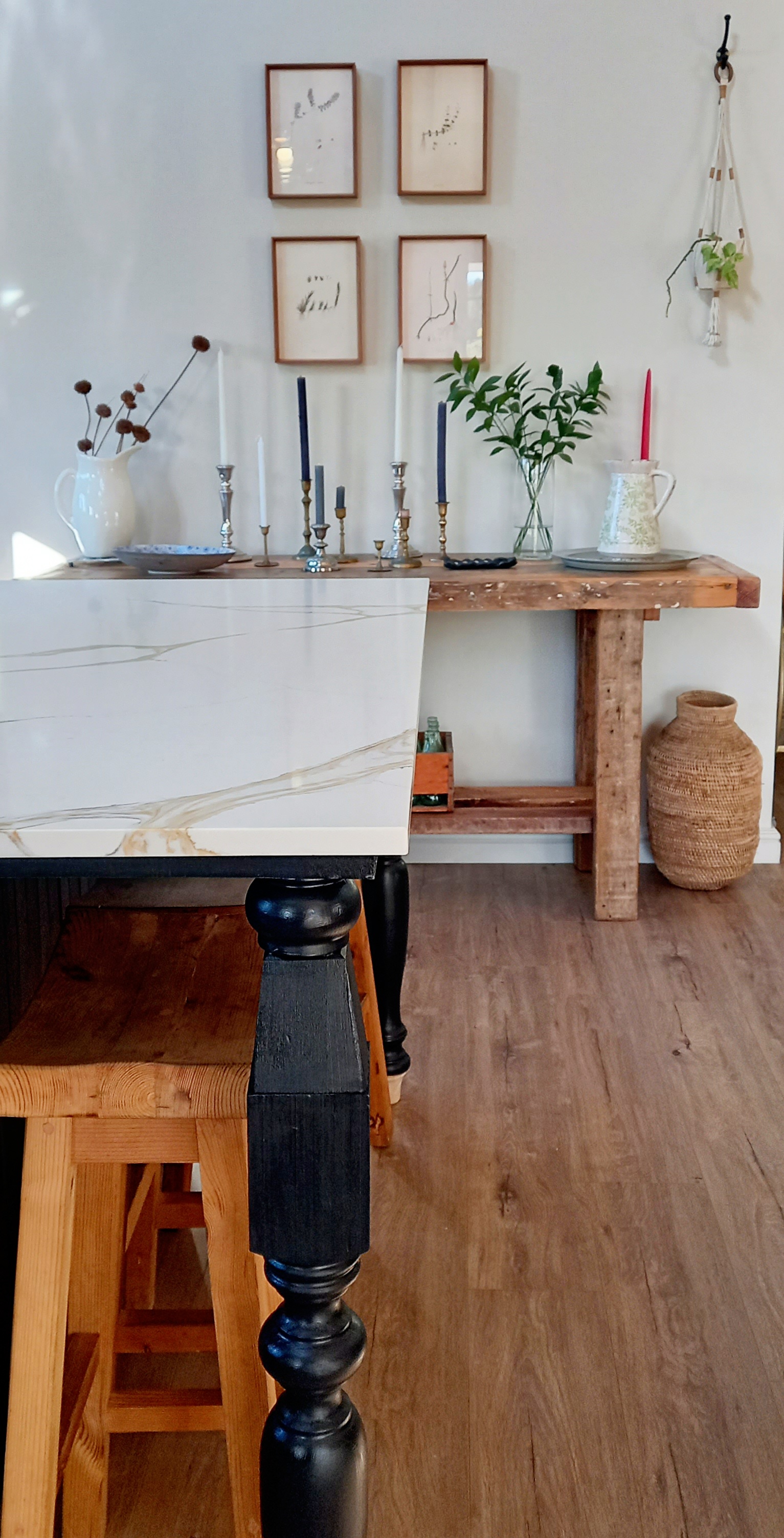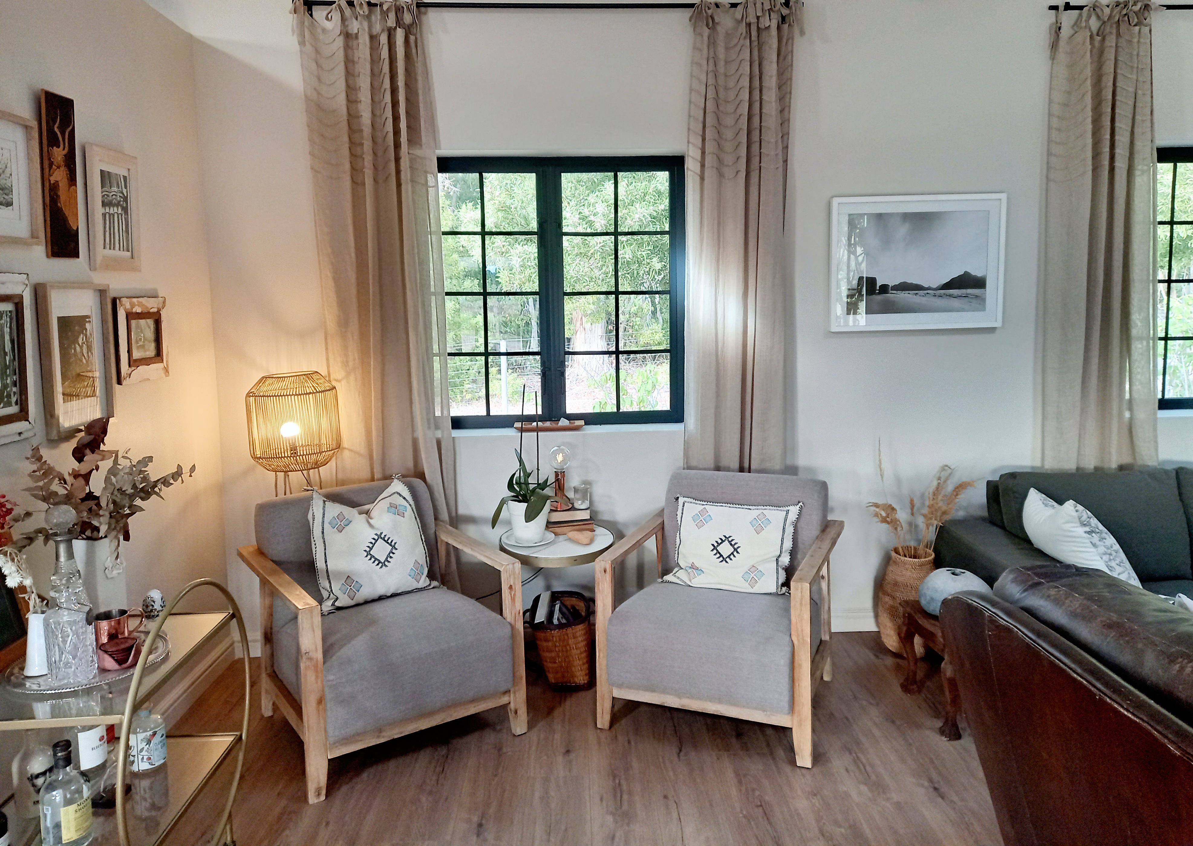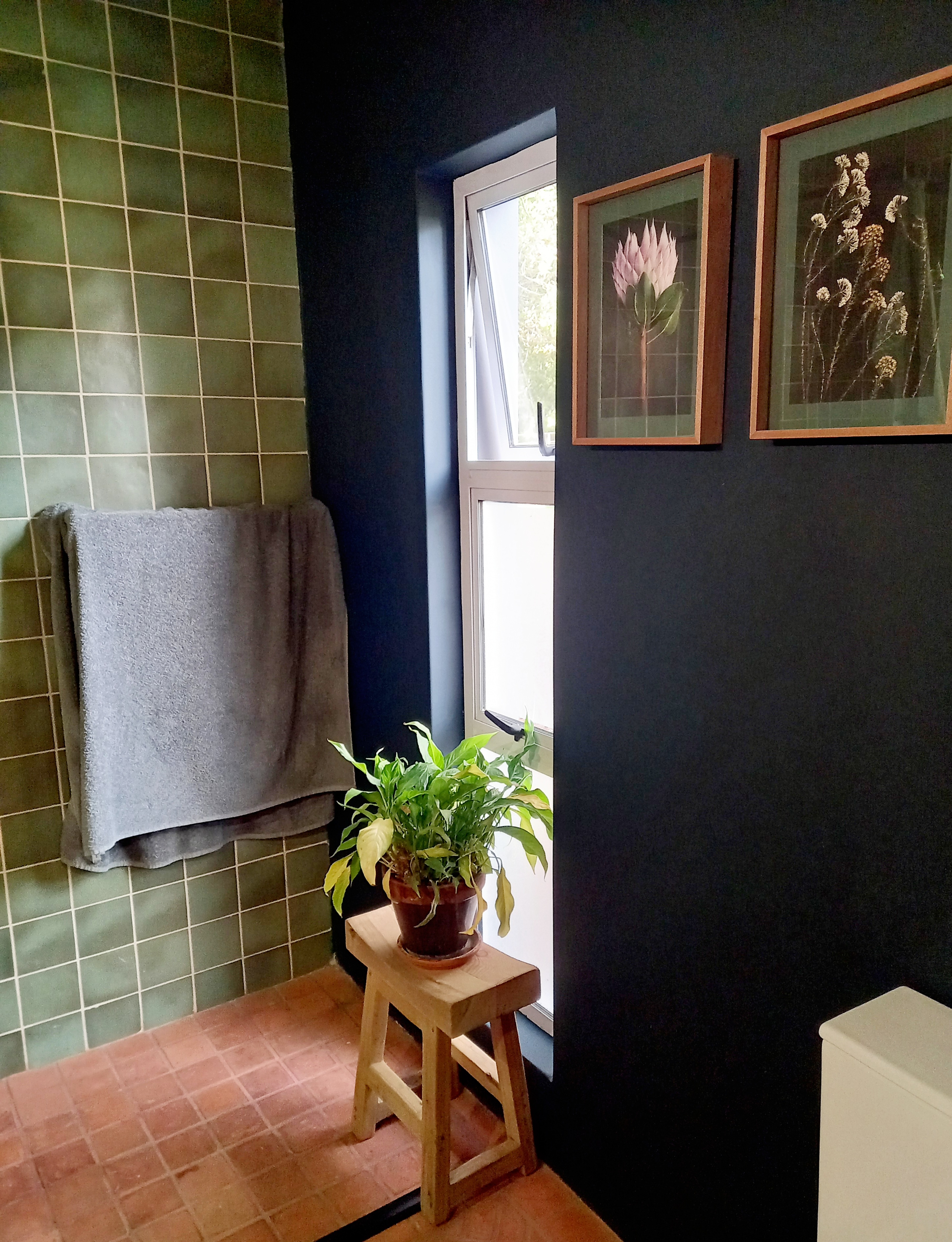 The kitchen and lounge needed a refresh. So using colour, I injected new life into the two areas by painting the kitchen cabinets a soft green, allowing the inside to come in, and adding paint to the wall in the lounge to anchor the space.