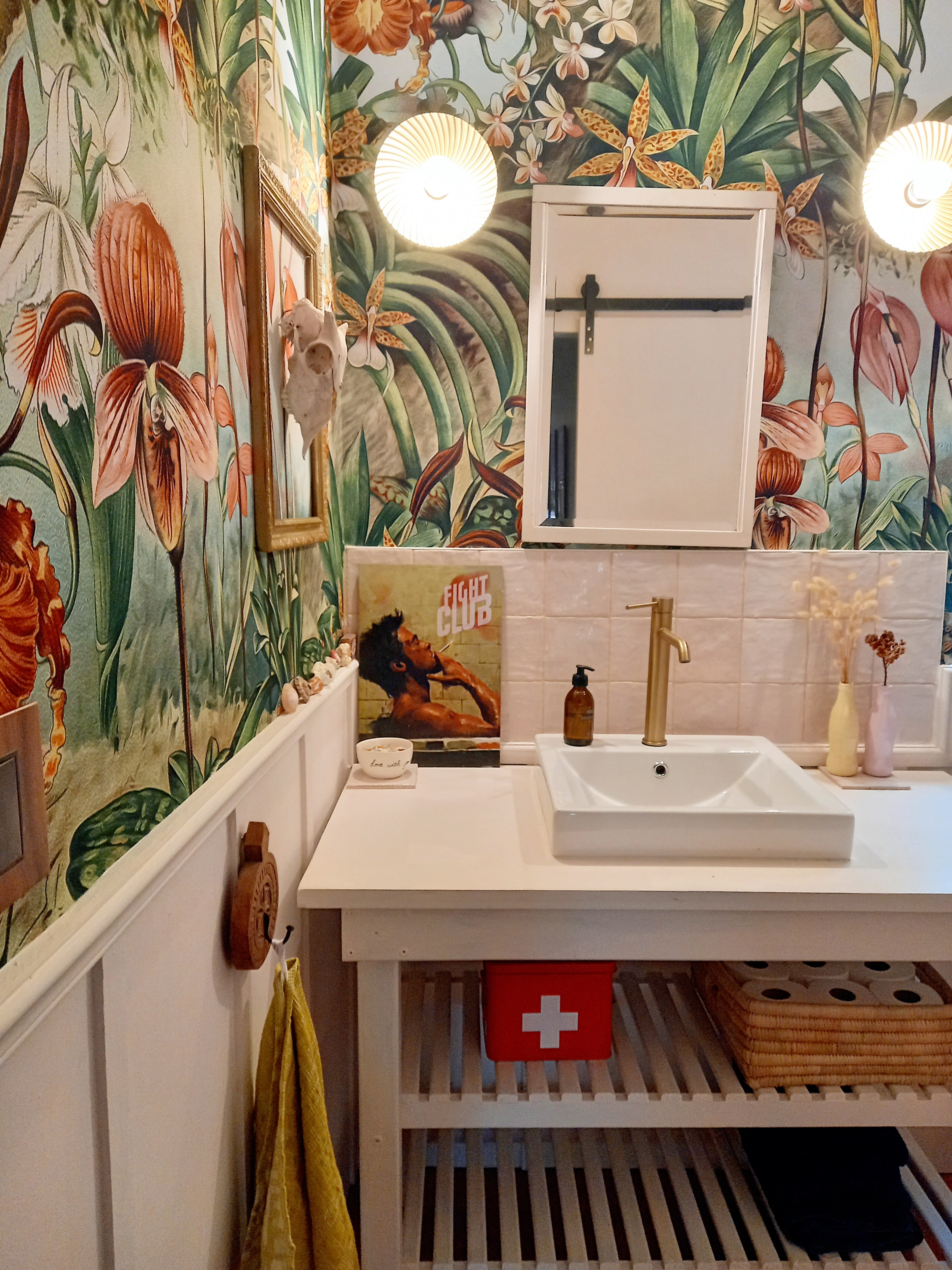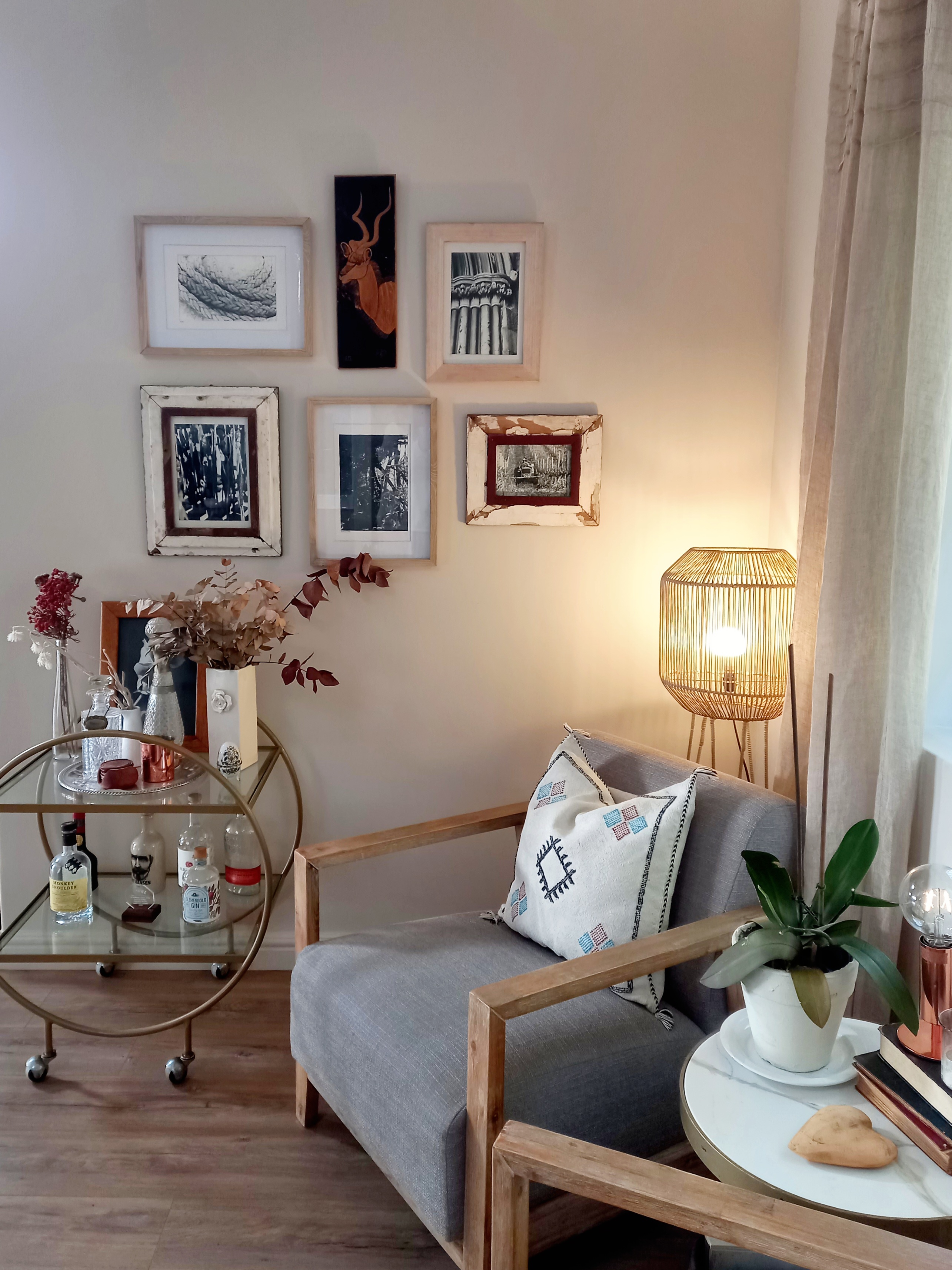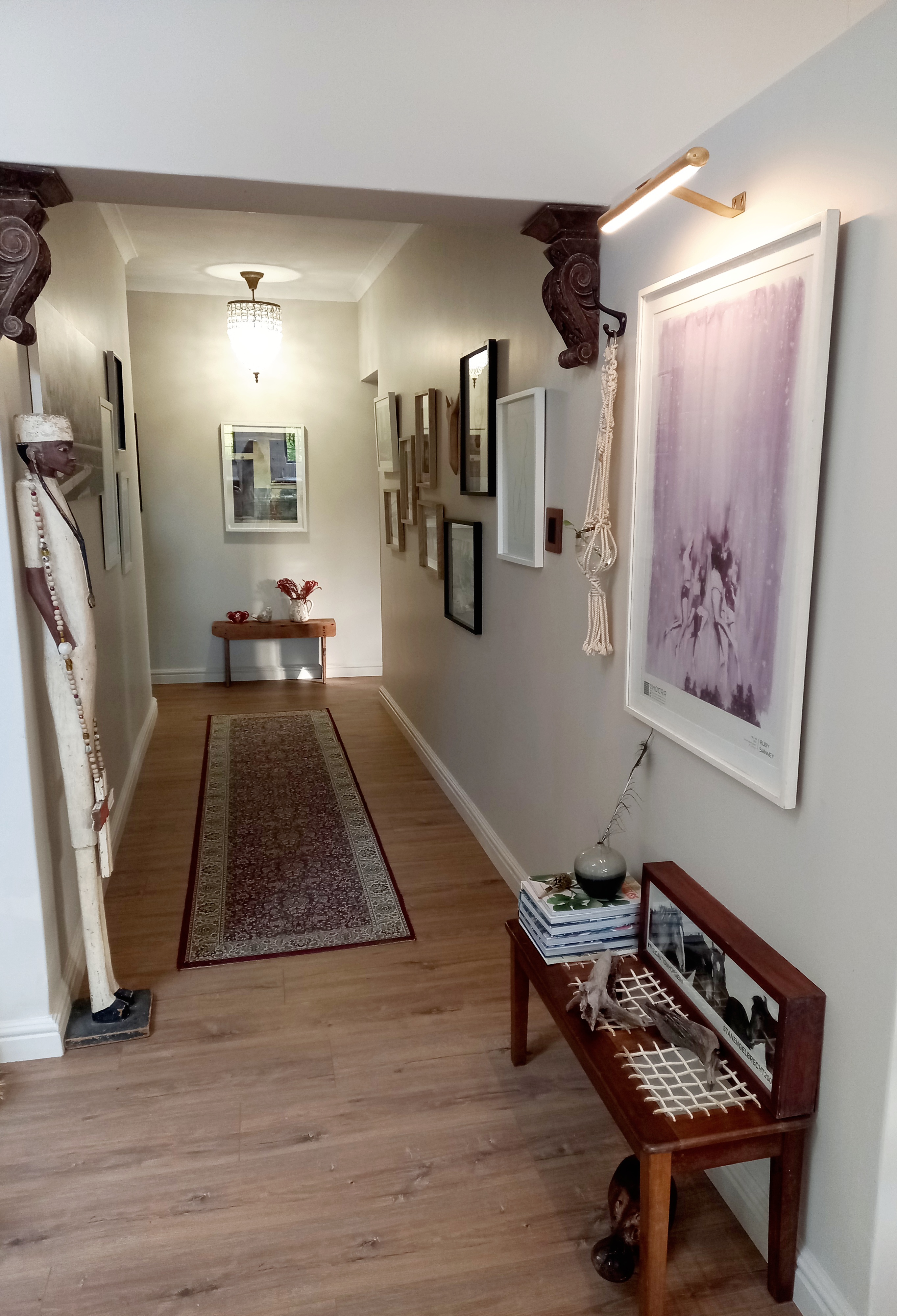 For this project, the top kitchen cabinetry was removed & replaced with floating shelves thus opening up the kitchen. Additional lighting was added to go above the kitchen island. The orange coloured laminate flooring was replaced with light oak laminate flooring. Wallpaper from an image I shot, was applied to the feature wall in the bedroom. The bathroom sink was removed & replaced with a vintage unit with the basin on top. The whole flat was repainted in Plascon Silver & a deep blue stripe running along the top of the wall was painted in the kitchen & lounge area thus anchoring the space.