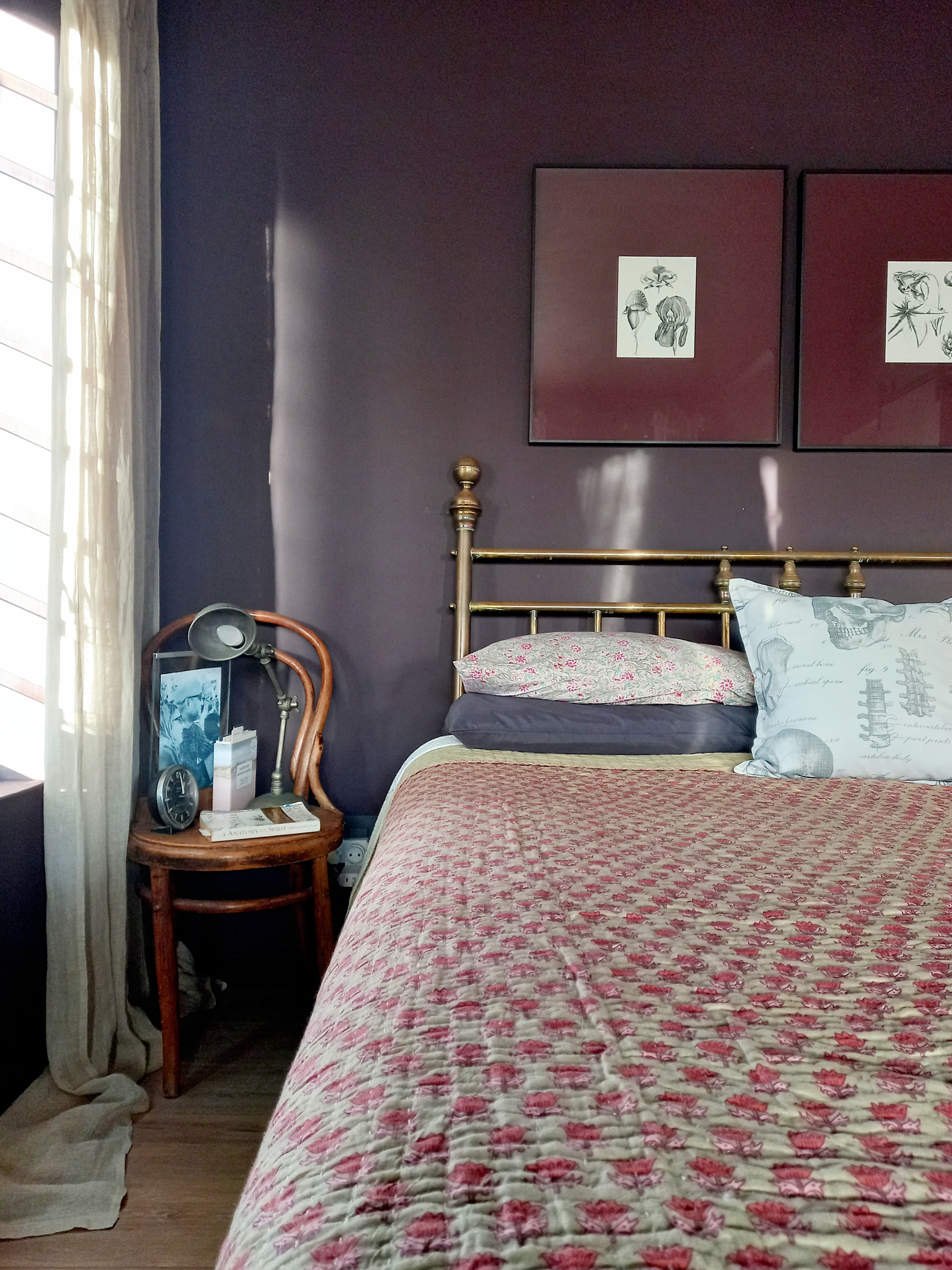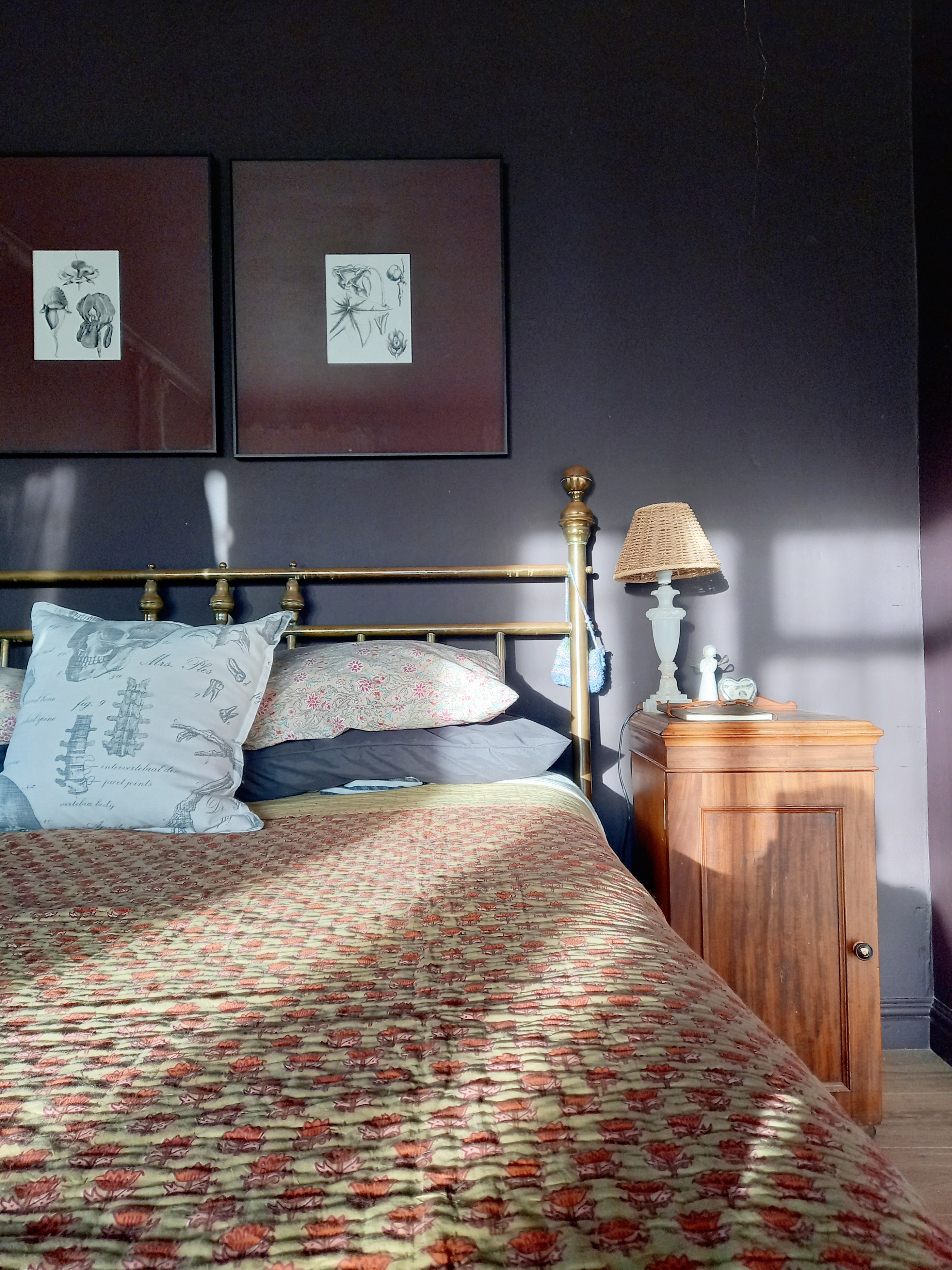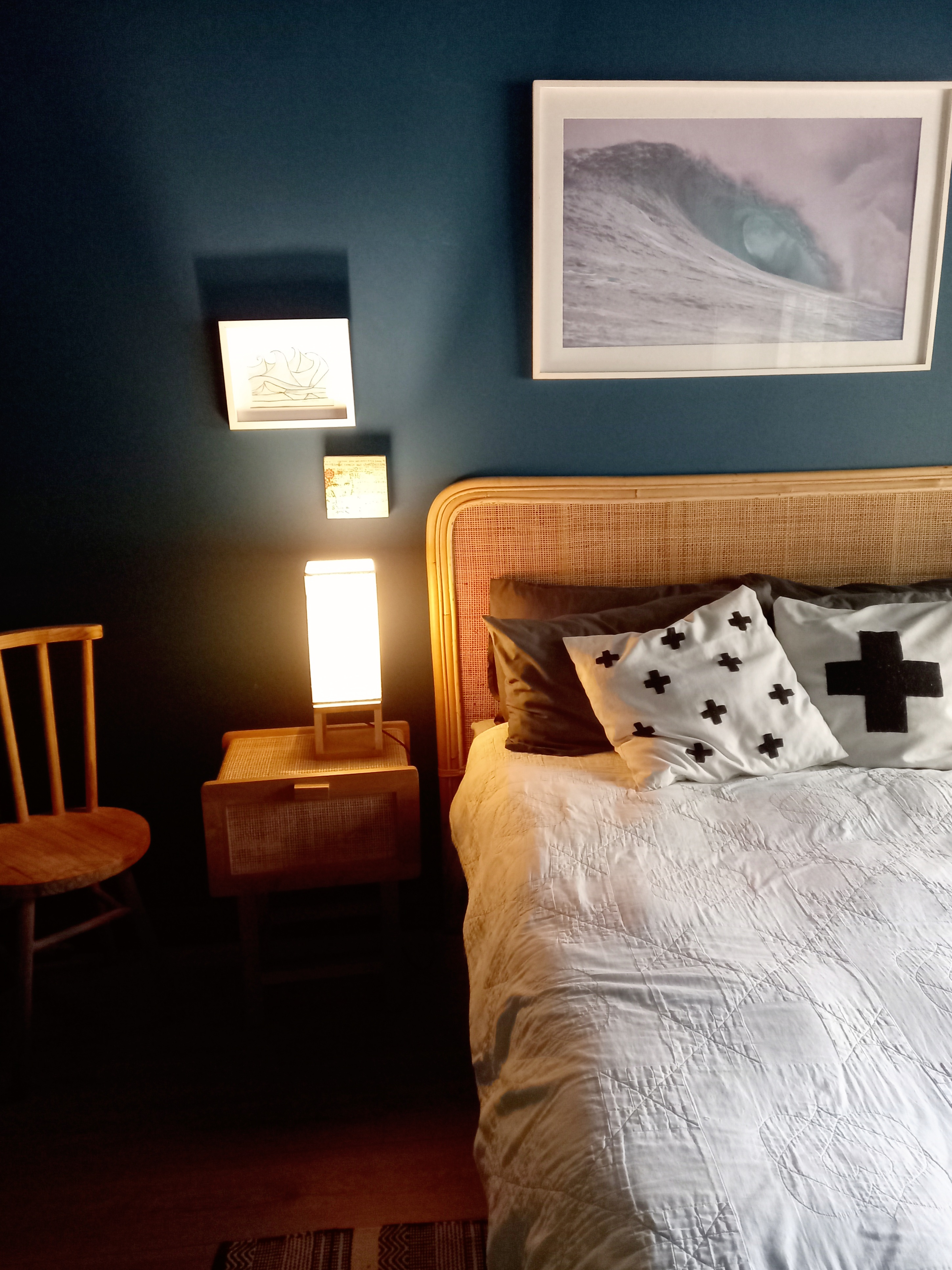 A bedroom was created in an industrial style loft using a room divider to divide the room from the lounge; the back of which became a space for a bookshelf in the lounge and a hanging wardrobe in the bedroom. The room was painted in midnight blue to create a cosy room for a good nights' sleep!